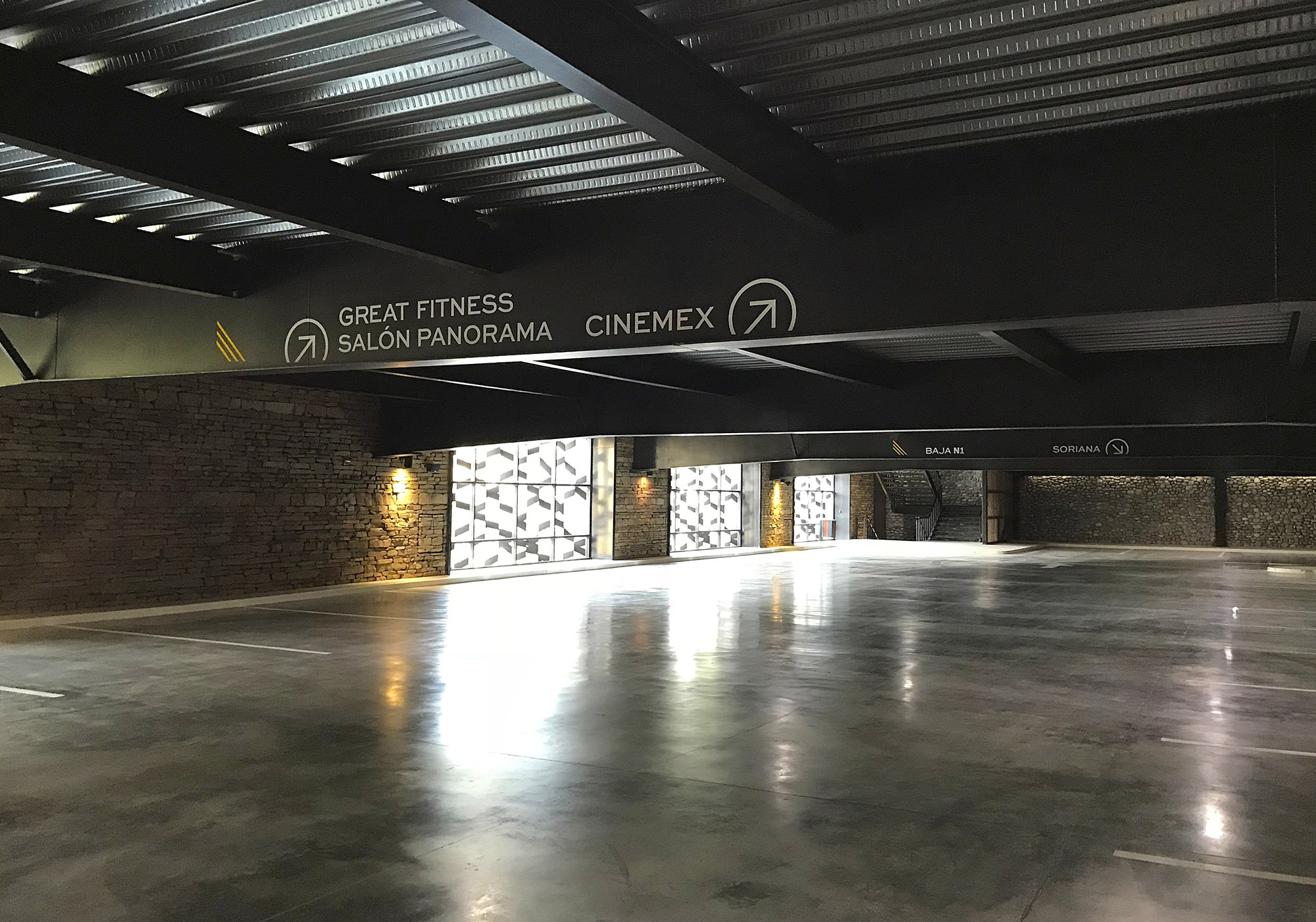 Diverse applications were designed, such as environmental graphics applied to latticework, illuminated hanging signs and level directories for every area.